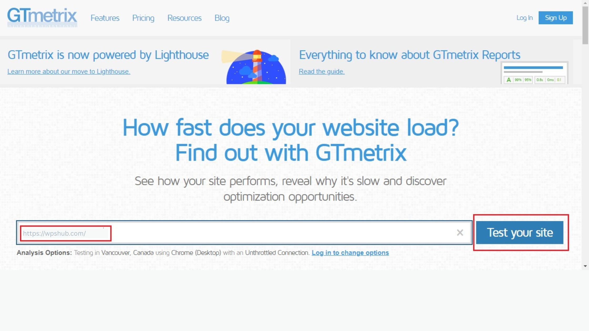 Just head over to GTmetrix.com and enter your site or page URL, then click the Test your site button.