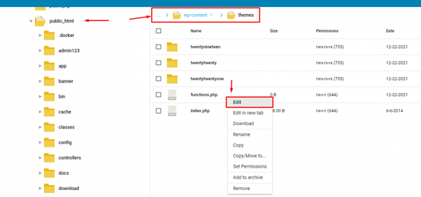 3. Browse functions.php file by following the path public_html>>wp-content >> themes.