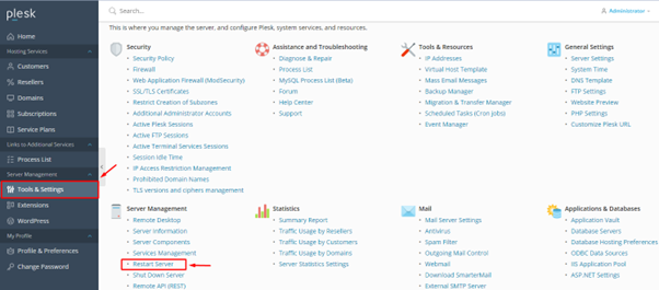 Applying configurations or troubleshooting other issues requires you to reboot and restart the server. Plesk users can easily restart their private servers with administrator access.