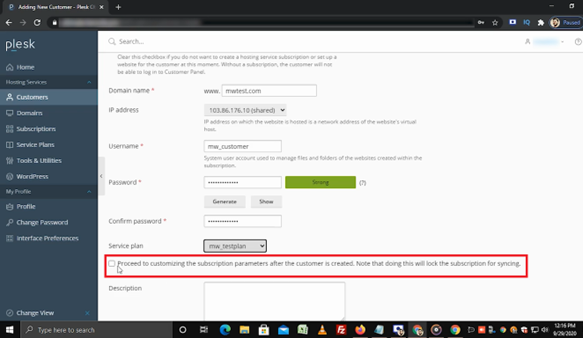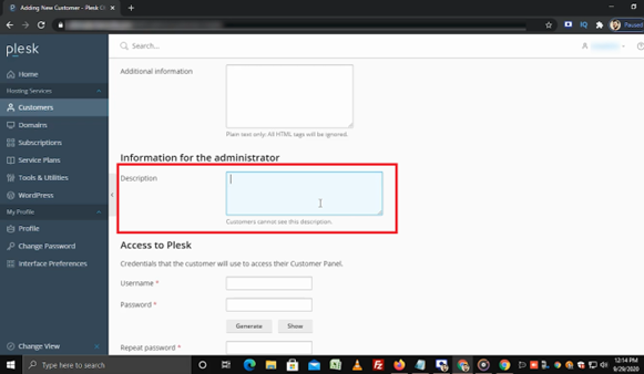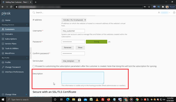 • If you want to add any description then you can add it in this textbox. This information is only visible to the Plesk administrator or reseller.