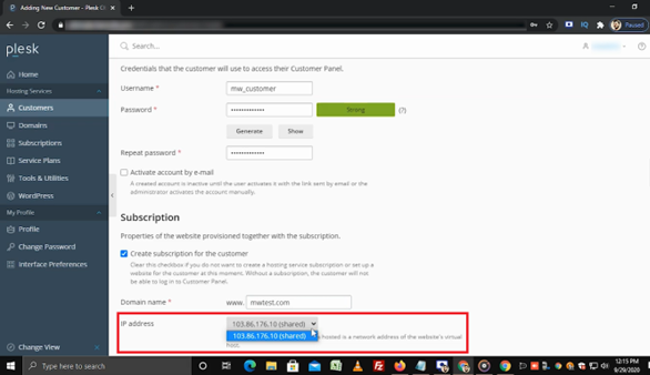 • In the Access to Plesk section, enter the username and password in their respective fields. Re-enter the same password in the Repeat password field. Make sure the password you enter must be alphanumeric. If you want to use an auto-generated password then click on Generate. Here, we have manually entered the password.