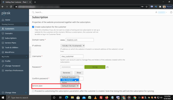 • Choose the Service plan from this dropdown. Here we have already created this service plan so we’re selecting the same.