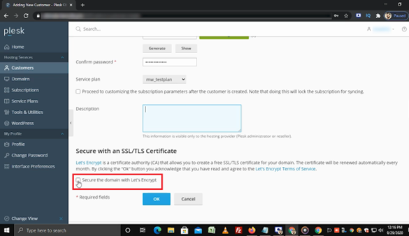 • Secure your domain with Let’s Encrypt SSL by selecting this checkbox. Make sure your domain is pointing to a server. You can install Let’s Encrypt SSL once you add the customer to Plesk.