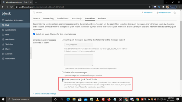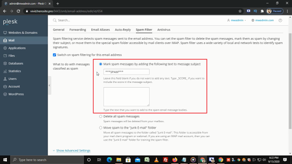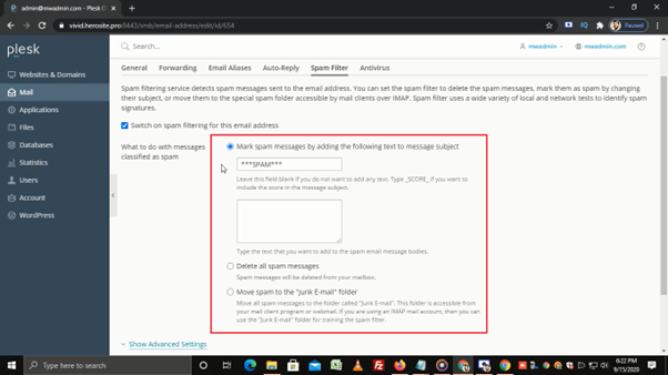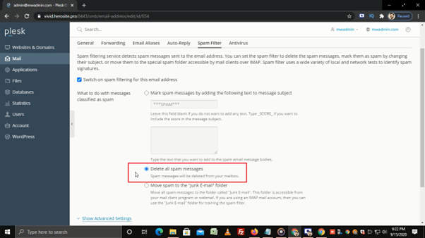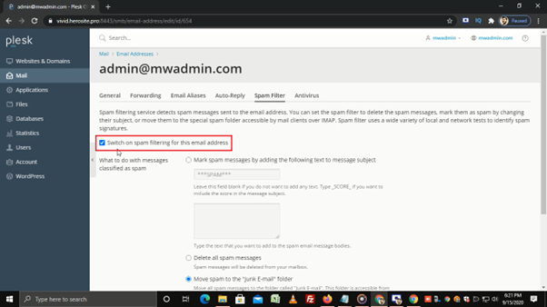 Follow the below-mentioned steps to enable spam protection in Plesk: