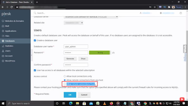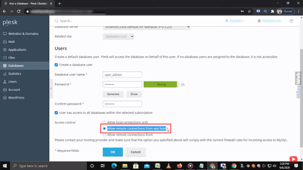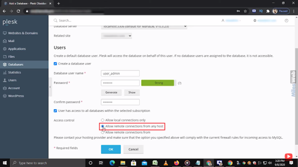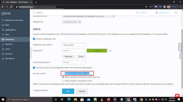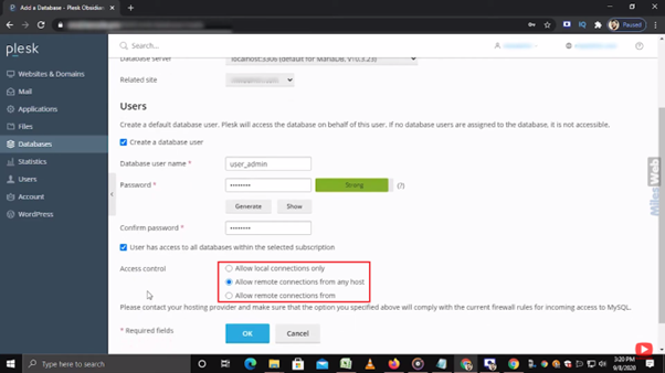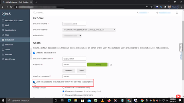 • In the Access control section, you can allow the user to access the database from these options.