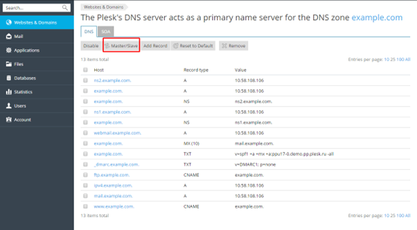 2. The Plesk DNS server can be reverted to the primary name server by navigating to Websites & Domains > DNS Settings and click Master/Slave.