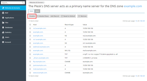 - You can also disable DNS for your domain in Plesk. If you have external primary and secondary name servers that are authoritative for your websites, this option is the best to use.