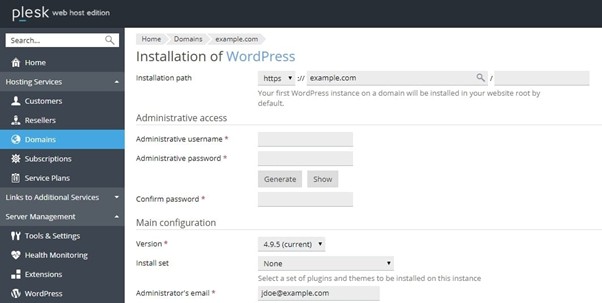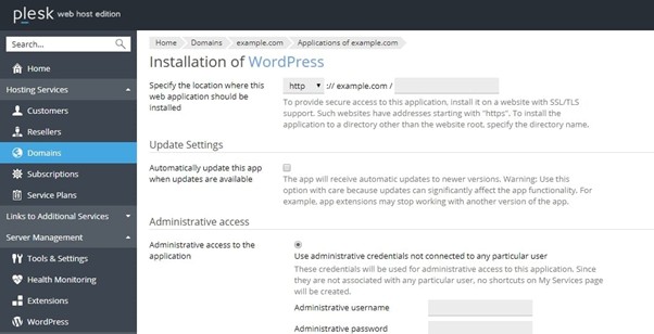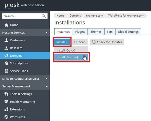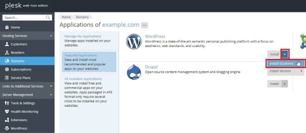 For installing WordPress with the custom settings, navigate to Domains > example.com > WordPress > Install > Install (Custom):