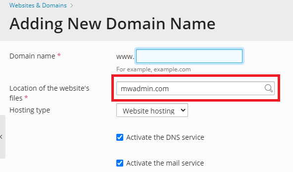 - Now in the Location of the website’s files, you can see the name of the primary domain by default.