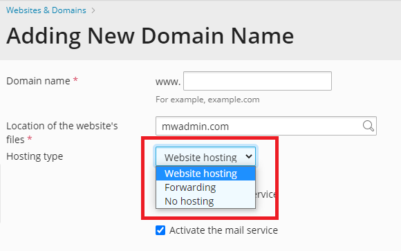 - From the drop-down box of Hosting type select any one option. In that, the website hosting option allows you to host a website and email services. The forwarding option allows you to redirect traffic from one website to another website. No hosting option allows you to host DNS and email services, but not a website.