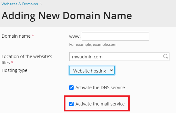 - If you wish to use email services on the same server then tick the option Activate the mail service. If you’re using any remote mail service then untick this option.