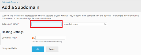 A subdomain is an additional part of your main domain, based upon a prefix name that you choose. For example, if mwadmin is my primary domain and the subdomain prefix is howto then the subdomain is howto.mwadmin.com