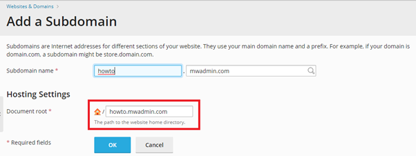 - In the document root section, you can see the default home directory path which is the combination of your subdomain and primary domain. You can modify this field as per your choice.