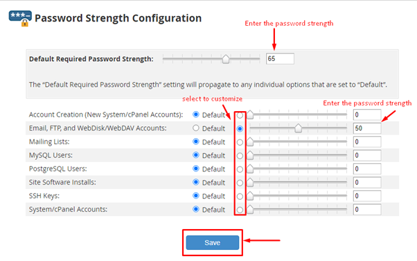 4. Set the Default Required Password Strength for your overall hosting account by entering it in the text field.