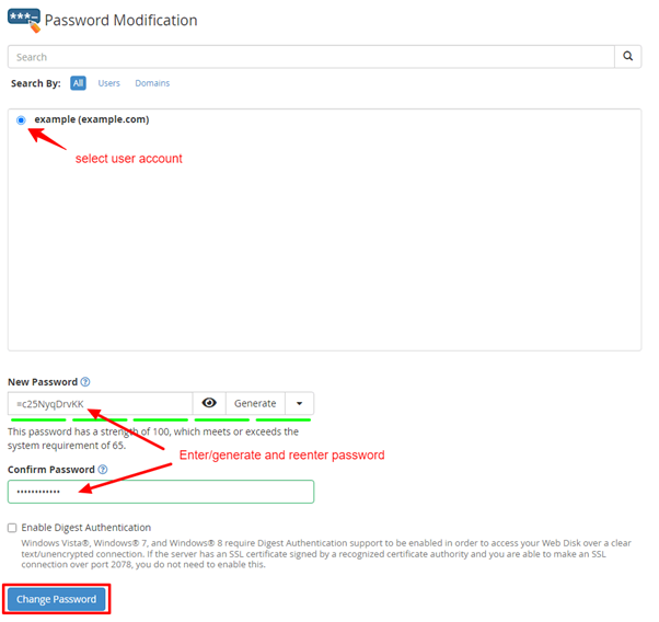 The Password Modification interface will open. Here you can change the password of your hosting users.