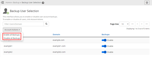 5] Go to Account Actions drops down, pick the appropriate option to enable or disable all cPanel account backups.