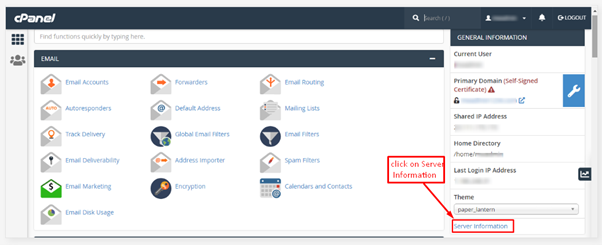- Click Server Information in the right side margin of the screen. You are directed to the Server Information page, now check the cPanel Version from the same.