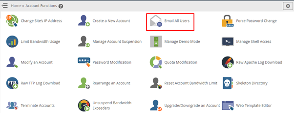 This interface allows you to send emails to all WHM/cPanel users at the same time. This functionality is handy if your server goes down for a period of time for maintenance or if you need to notify reseller users about security concerns.
