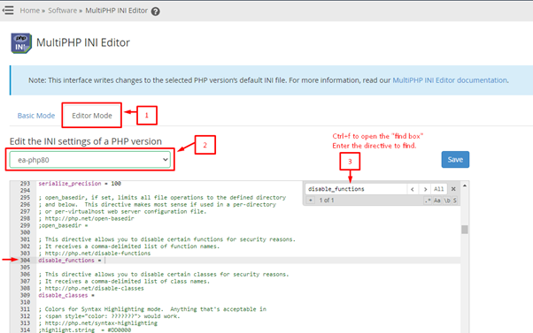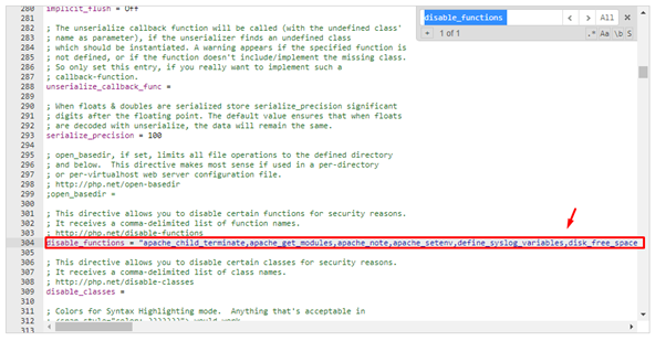 6. Press Ctrl+f to bring up the “find-box” and type disable_functions.