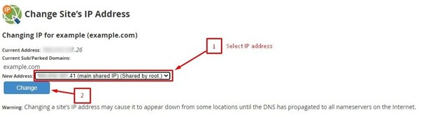 The Change Site’s IP Address panel will open, where you will find details like the Current Address and Current Sub/Parked Domains.