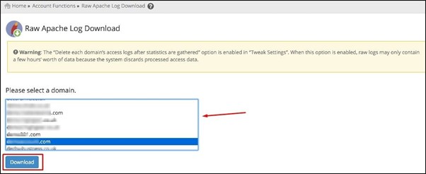 4. Select a domain from the list whose FTP log you wish to see and click Download.
