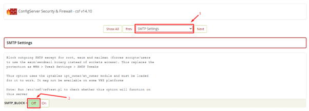 5. Select the SMTP Settings section and click the Off switch for the SMTP_BLOCK field.