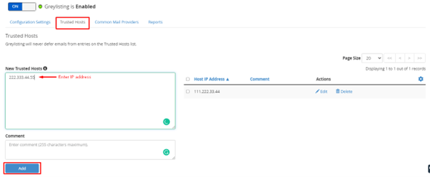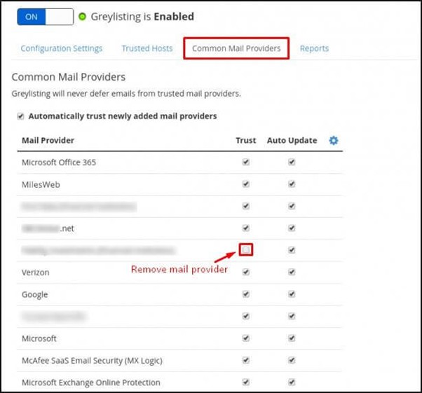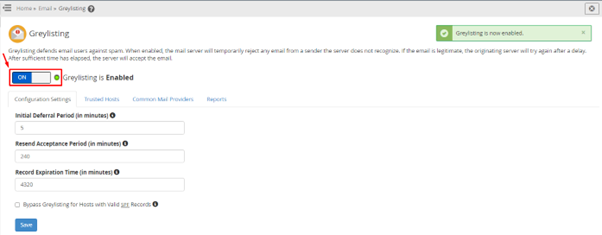Switching ON Greylisting will display options like- Configuration Settings, Trusted Hosts, Common Mail Providers, and Reports. These options customize Greylisting to filter emails, reaccept temporarily rejected emails, etc. We will see what you can do with these options.