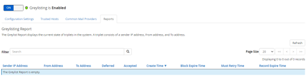 The last tab, Reports, is a log of Greylisting. It offers a concise summary of all the actions that Greylisting has performed in a tabular form.