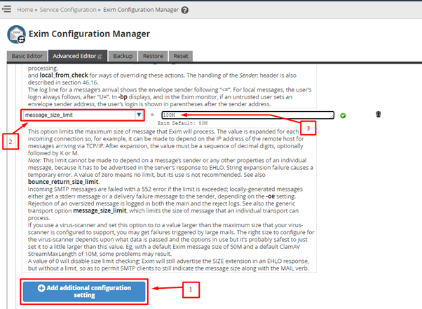 5. Select message_size_limit from the drop-down list and enter a value with M (as in MB) to assign the message size limit. ( default is 50MB )