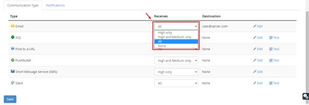 10. Click on the drop-down list in the Receives column of Email and select the priority of mail notifications you want to receive.
