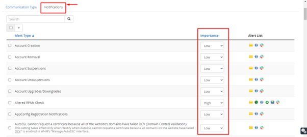 11. If you click on the Notifications tab, you can select the Alert Type and even assign it a priority level from the drop-down list in the Importance column.