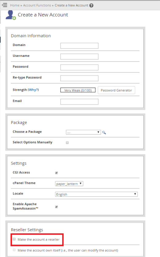 4. Scroll down to the Reseller Settings section of the form and select the Make the account a reseller option.
