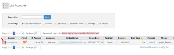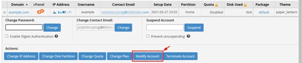 - This section allows you to change the primary domain, username and contact email of the cPanel account.