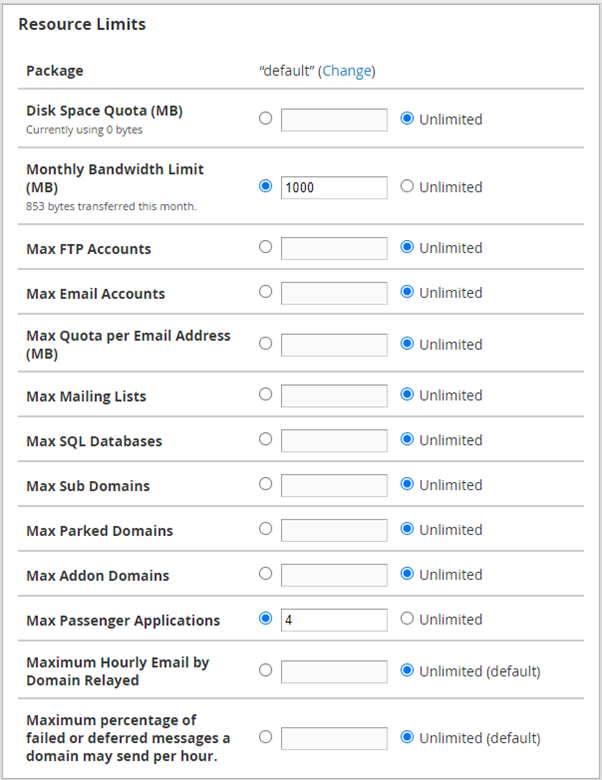 - It allows you to set limits on the cPanel account for the consumption of server resources like disk space(memory storage), bandwidth, databases, email and FTP accounts.