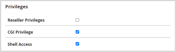 - Privileges: You can grant/activate privileges to grant a certain level of authority to the cPanel account.