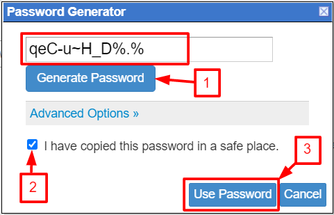 Alternatively, you can also use the Password Generator button that will produce a random string that you can copy and paste as a strong password. We recommend you copy the password somewhere so that you can use it again.