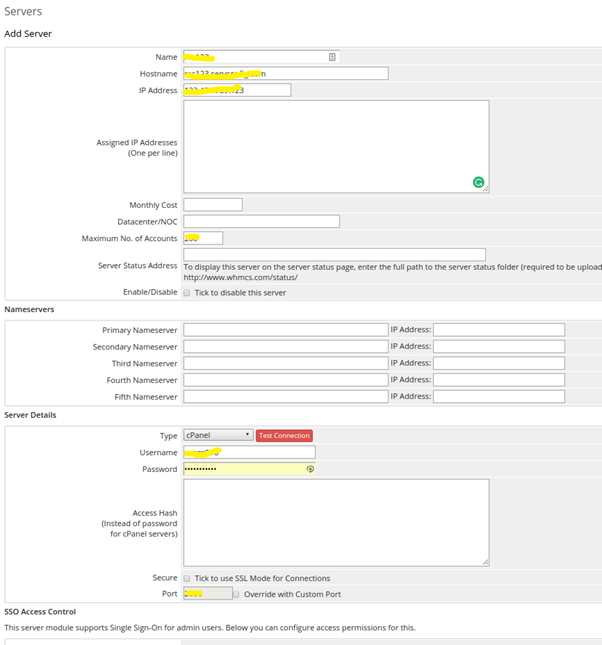 This will take you to the Servers page where you need to fill in the fields as required. The only compulsory fields are Name, Hostname, IP Address, Type, and WHM username/password.