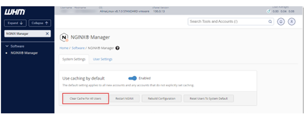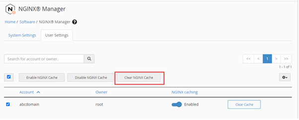 In the System Settings, you have the option to Clear Cache for All Users. You can clear the cache for multiple users. To do so, select the usernames you want to clear or select the checkbox above the table to select all the visible users. Then, click on the Clear NGINX Cache.